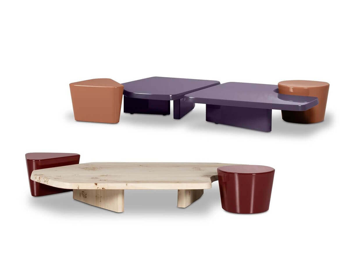 受群島形態啟發的AEGATES 矮桌,這是Baxter 風格的辦公室家具作品。由光滑的漆面斜邊實心木材製成,與自然白楊木的咖啡桌相得益彰。