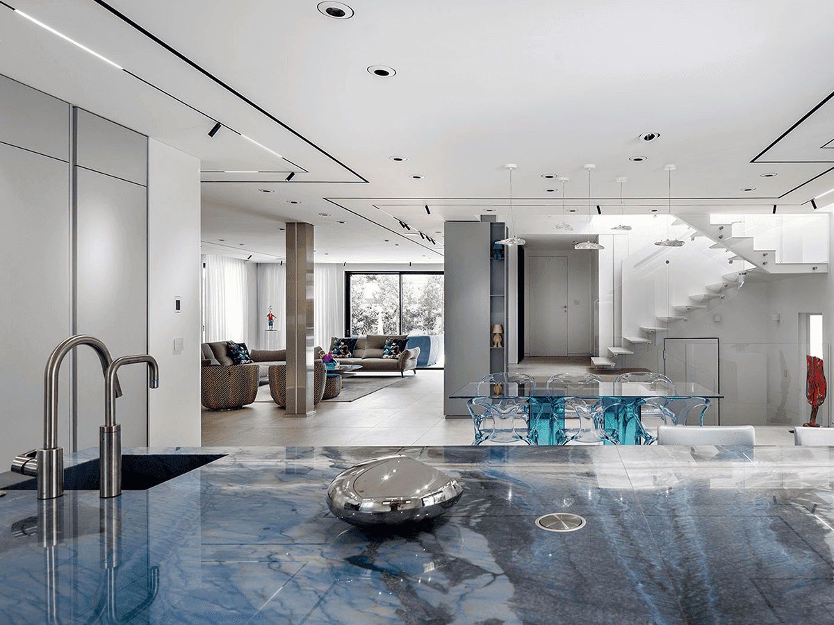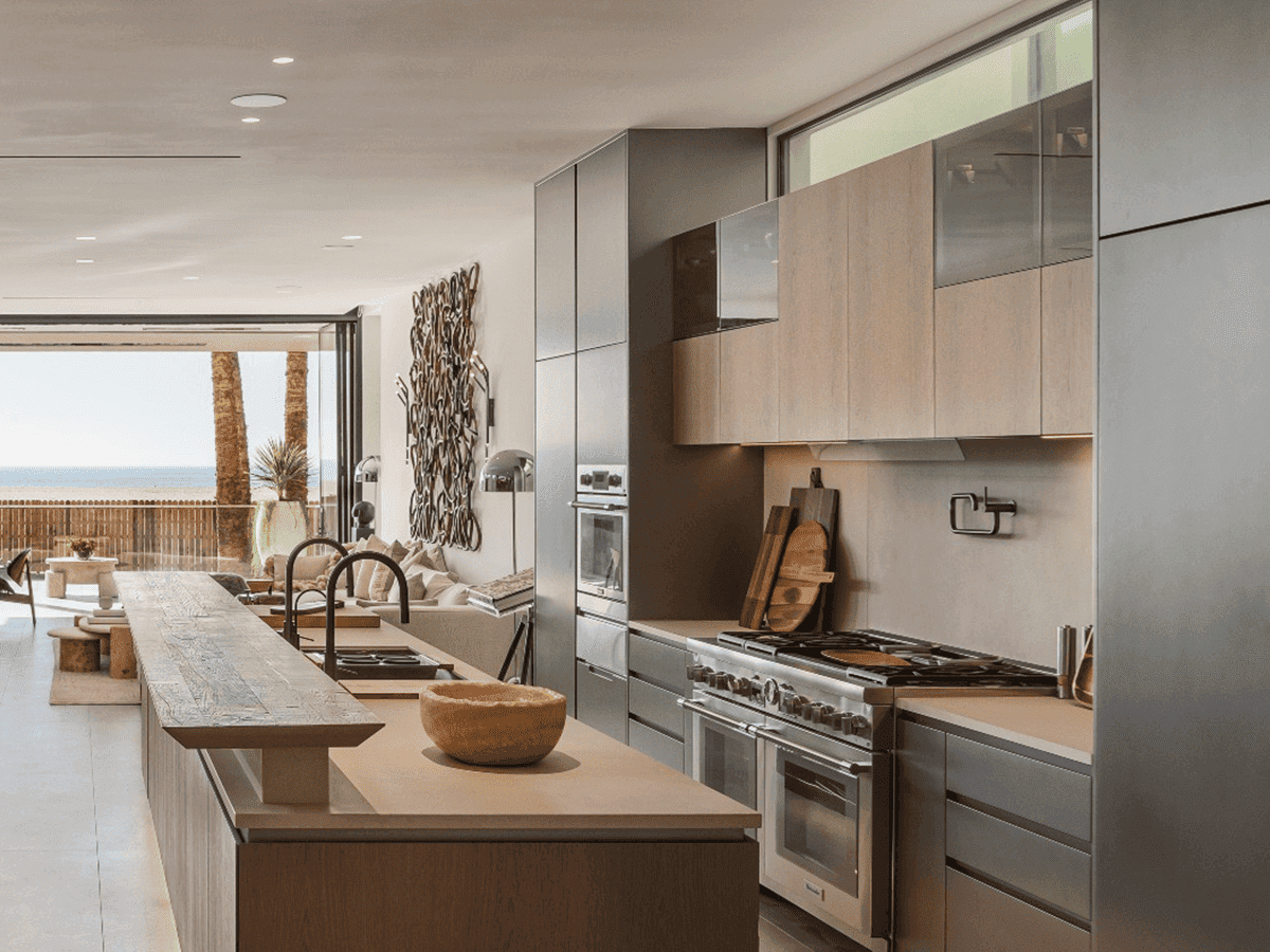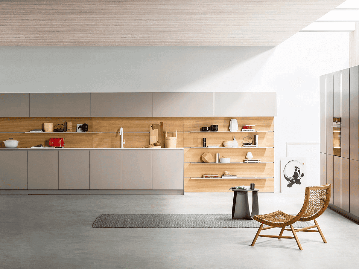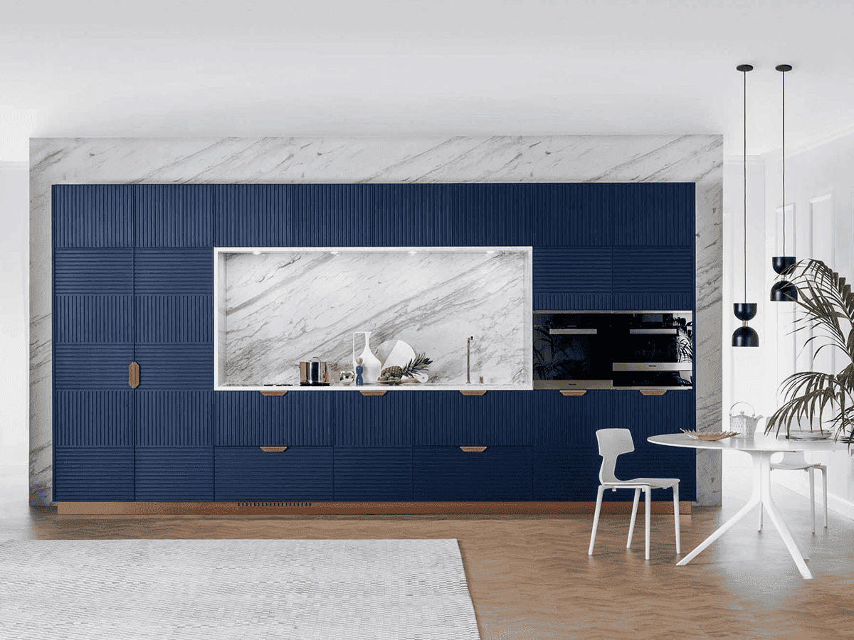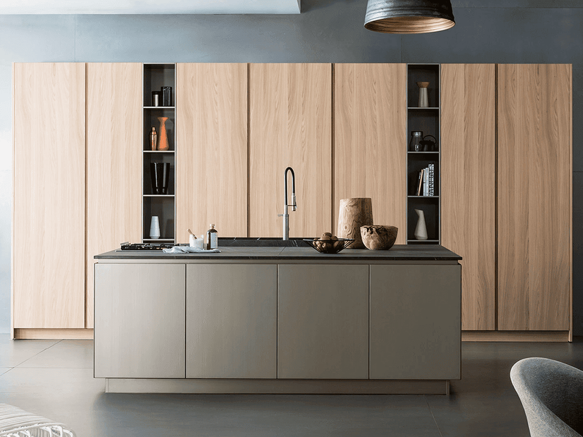 廚房由一個帶腳的島台組成,中島上方是金屬結構,頂部是圓柱形抽油煙機,此外還有帶有門、窗和開放式空間的立柱,與客廳完美融合。 D90系列廚房由Marco Taietta設計,其靈感來自航海世界,門板和型材在地板周圍形成一道纖細的安全帶。 D90 擁有緊湊簡約的設計,並融入了許多實用元素,例如窄型滑動衣櫃門和半島式吧台的貫通式抽屜。比利時藍石檯面和底面與阿登米色門板形成優雅的對比。