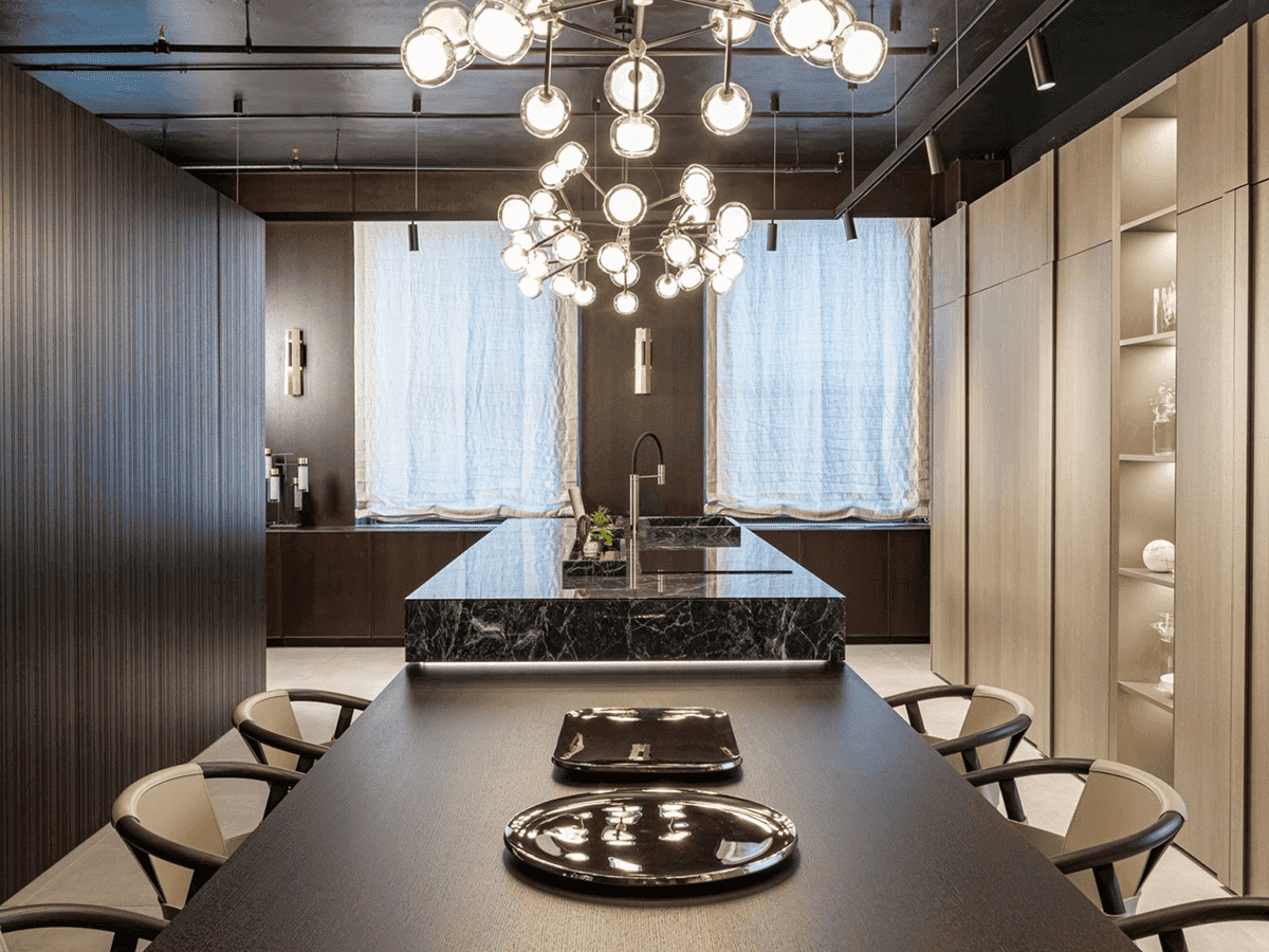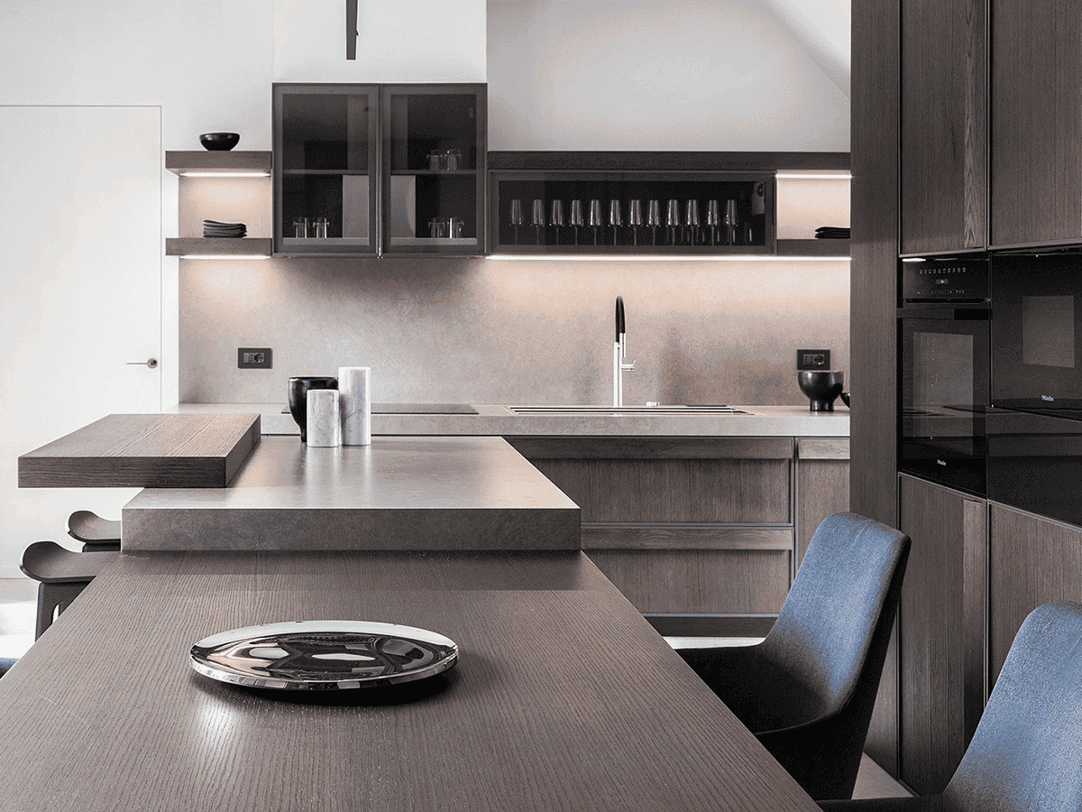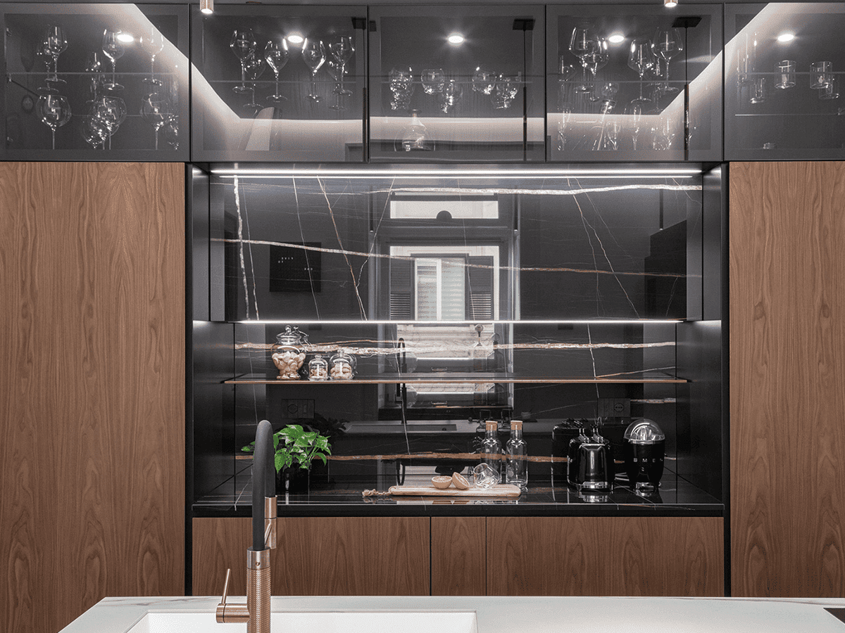 Neolite 廚房由 Ruadelpapavero 設計,包含一個覆蓋棕金色石材的大型島台,中央嵌有仿古青銅飾件,水槽、爐台、可垂直拆卸的烤箱和油煙機巧妙地隱藏其中。一旦這個珍貴的箱子被關上,廚房就變成了客廳,這要歸功於那些用古銅色門封閉的柱子和梧桐木背光窗戶。