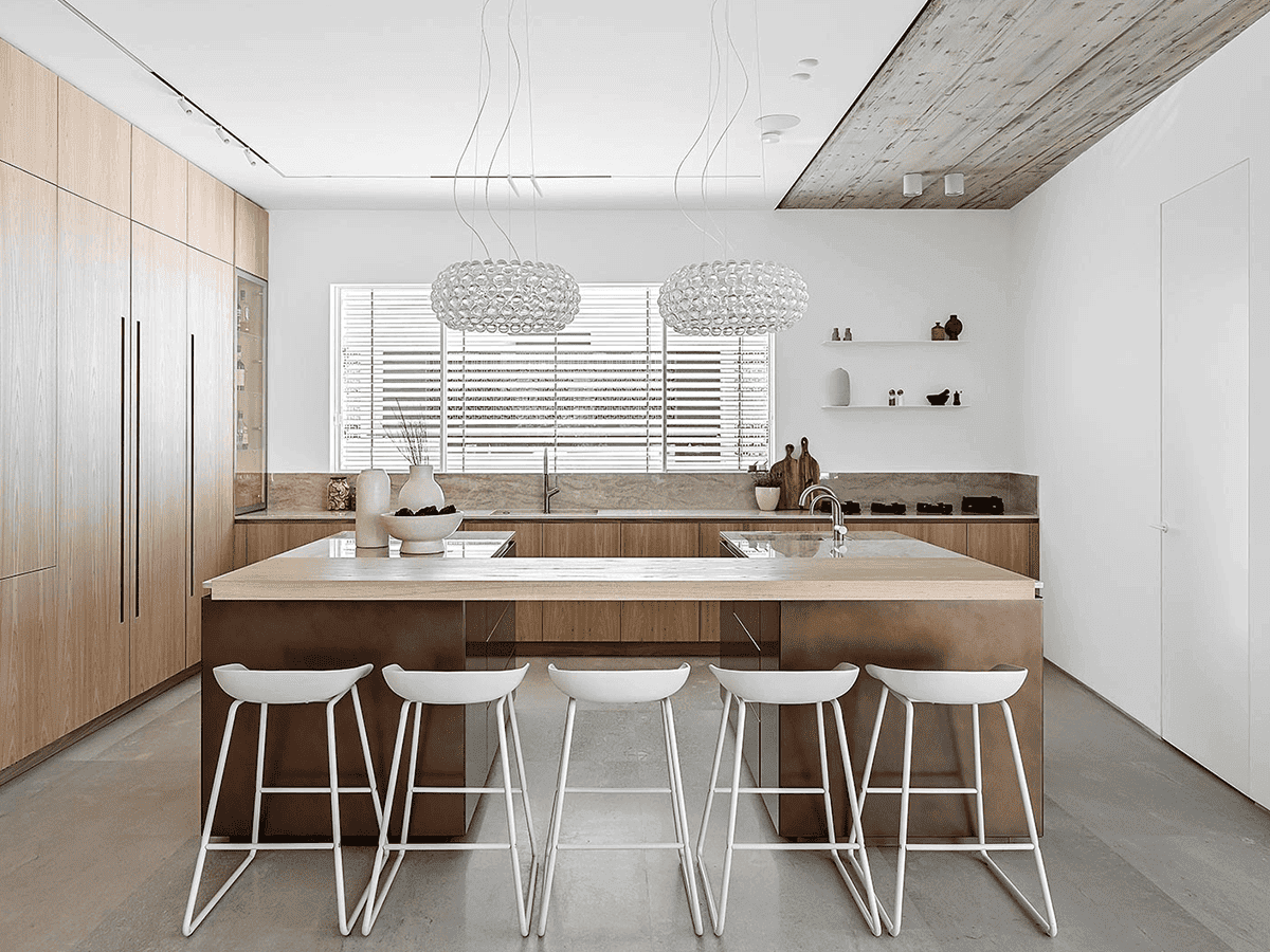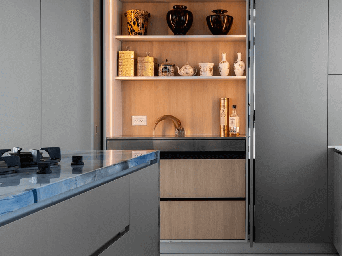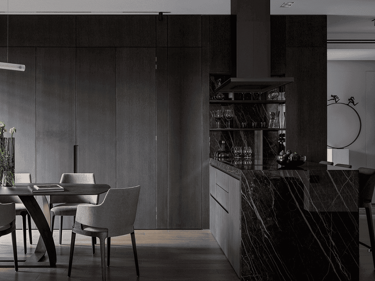 Neolite 廚房由 Ruadelpapavero 設計,包含一個覆蓋棕金色石材的大型島台,中央嵌有仿古青銅飾件,水槽、爐台、可垂直拆卸的烤箱和油煙機巧妙地隱藏其中。一旦這個珍貴的箱子被關上,廚房就變成了客廳,這要歸功於那些用古銅色門封閉的柱子和梧桐木背光窗戶。