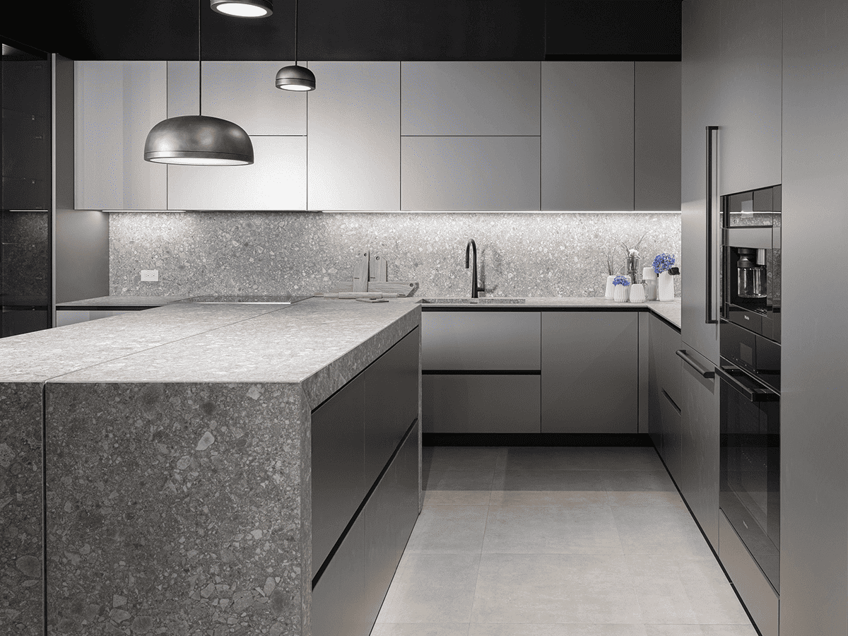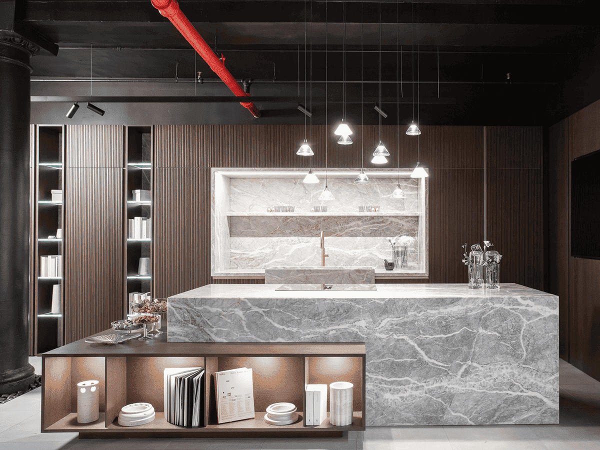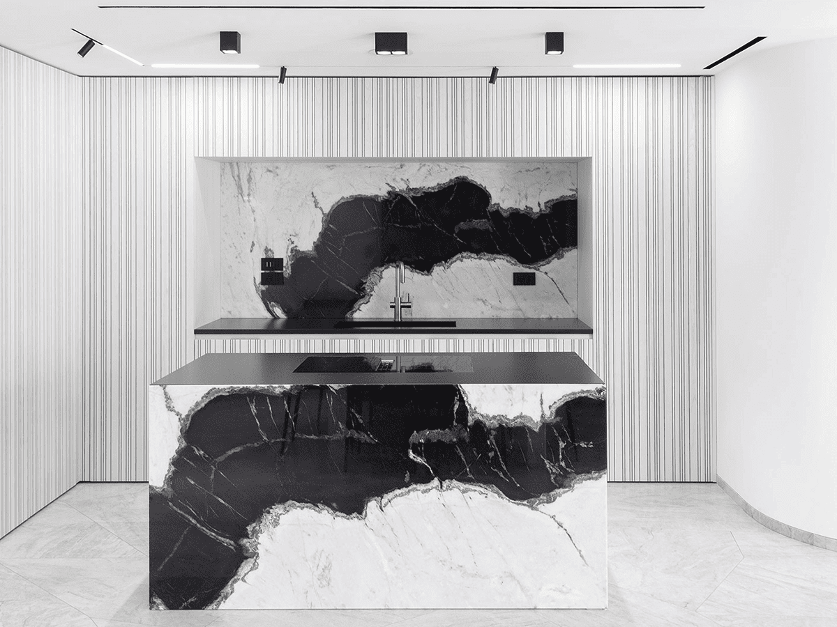 設計突出了天然石材的特性,石材是表面的主要材料,立柱門採用 Ceppo di Gré 石材,並安裝在青銅框架上,島台頂部和底部則採用黑色 Marquinia 大理石。中島的層架和櫃門採用棕色橡木,形成對比,營造出精緻的質感。 TM Italia 推出的 Neolite 廚房是 Petra 的升級版,同樣以天然石材的吸睛設計為核心概念。