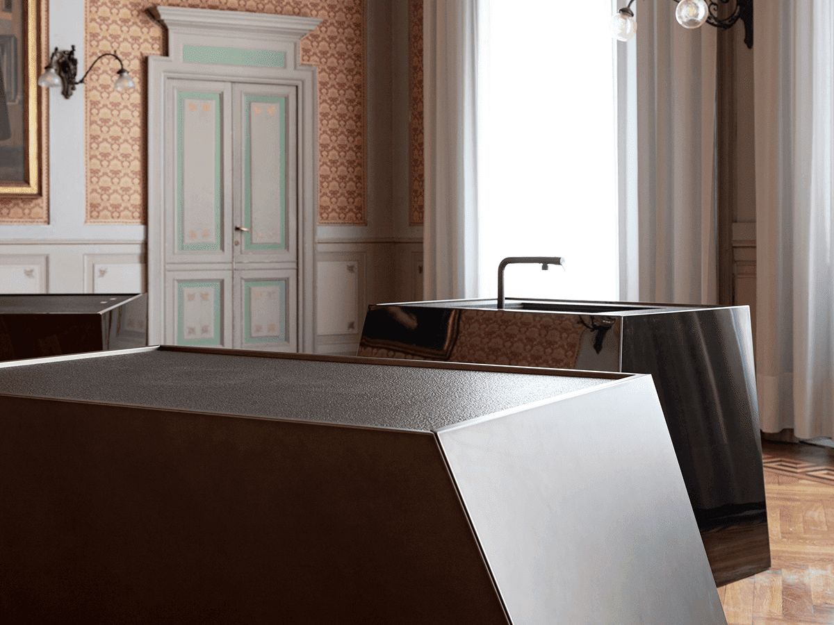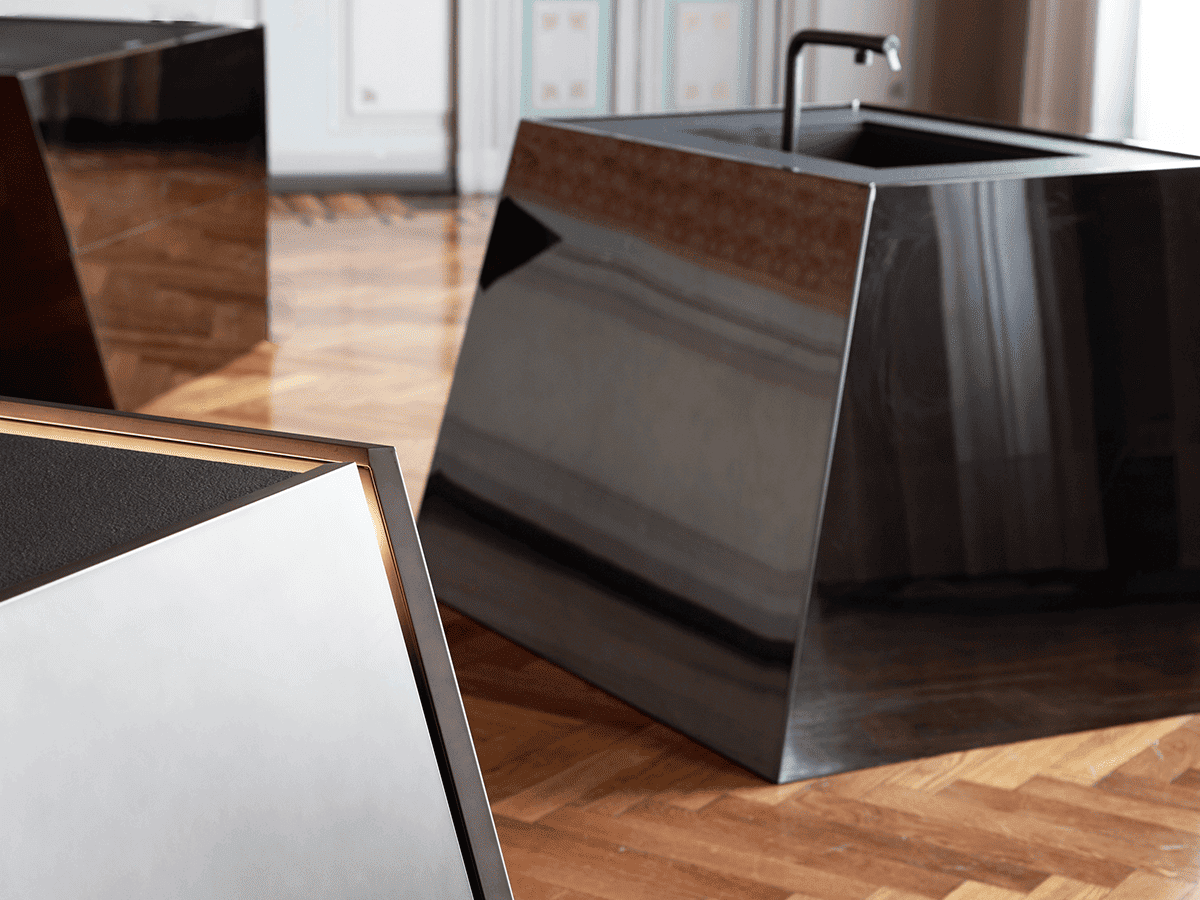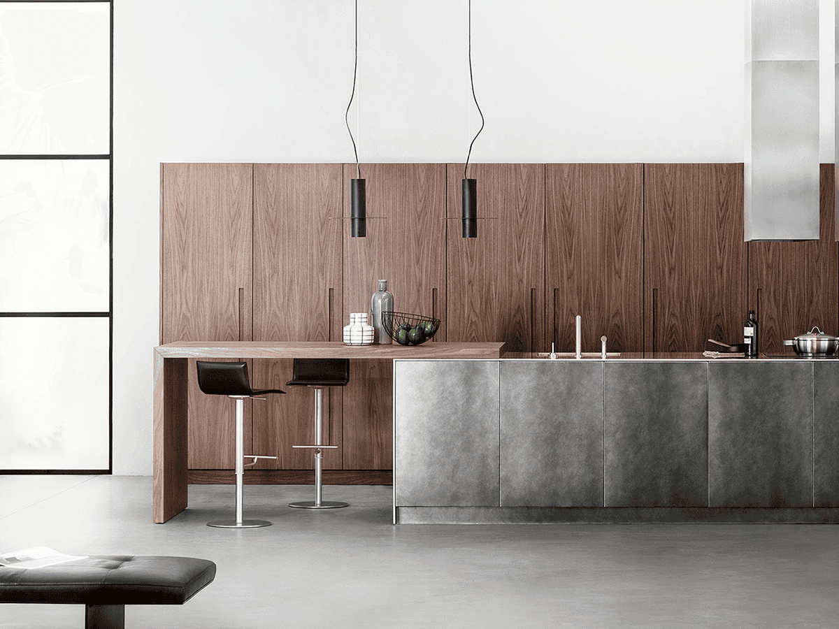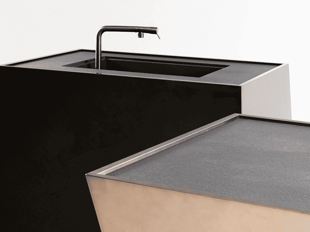 大約十年前,TM Italia 的首款智慧家居廚房誕生,這要歸功於 TM Italia LAB 實驗室的實驗。這款廚房名為 Petra,很快便成為代表公司風格和精湛工藝的標誌性產品之一。 Petra 由 Gianluca Tondi 設計,巧妙地運用洞石打造出一個塊狀島台,將檯面和電器隱藏起來,盡顯其獨特魅力。中島配備了內建 LED 照明的電動抽屜,而耐候鋼材質的立柱則配備了可透過遙控器控制的櫃門。最新版本 Petra (18) 由建築師組合 Bernhardt&Vella 設計,其特色在於採用內嵌式把手,這些把手水平和垂直交替排列,構成裝飾圖案。