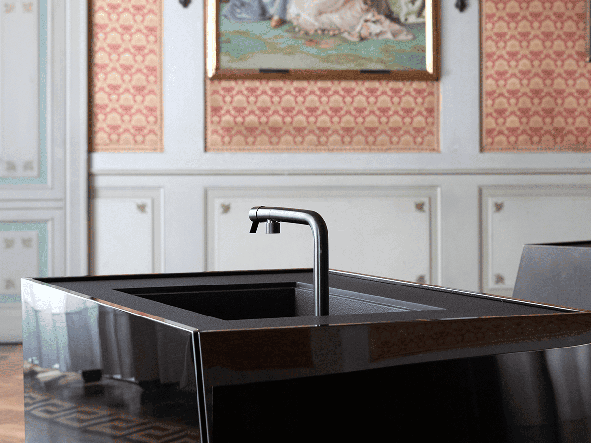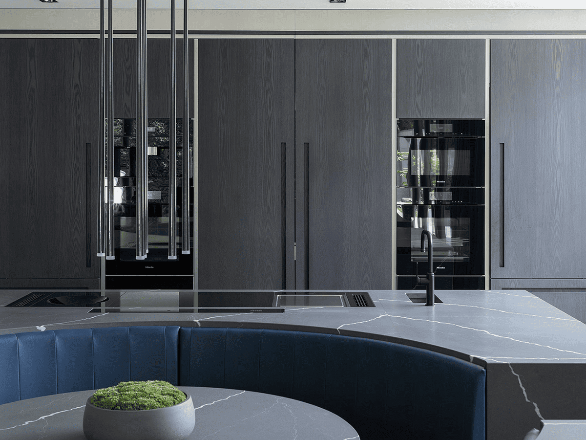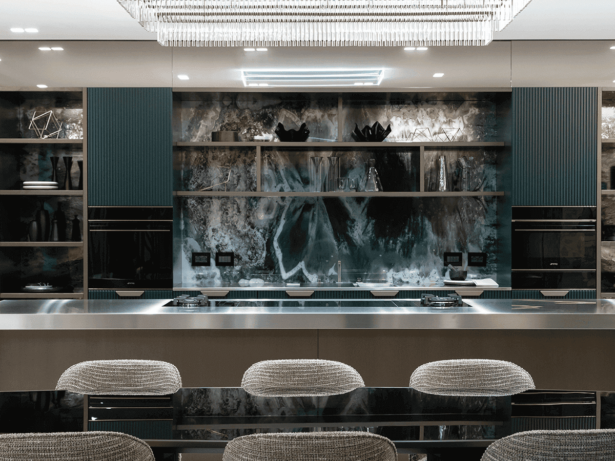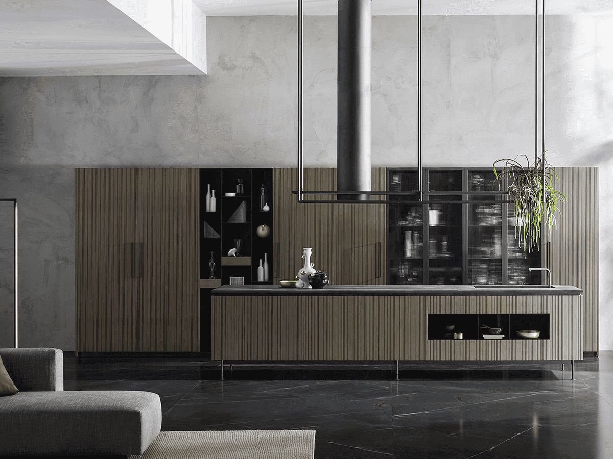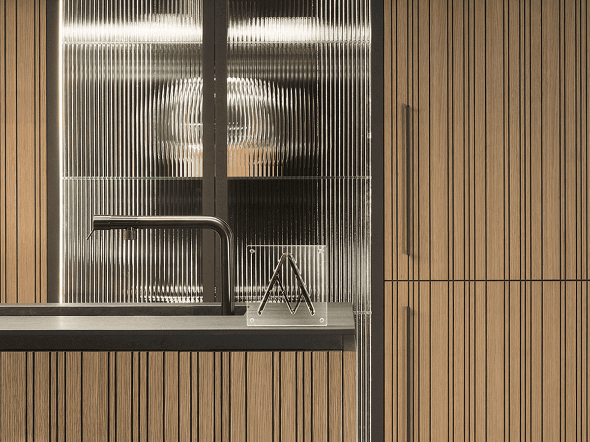 該項目採用了一種創新的生物塗層,其中的活性成分能夠有效中和廚房中常見的異味。 Miuccia系列廚房以其年輕動感的設計而著稱,這得益於拋光反光粉色銅質底座、支腳和把手的巧妙搭配,以及門板鮮明的色彩選擇,門板上還飾有立體條紋隔間。同樣由Ruadelpapavero設計的Rua系列廚房,其靈感源自工業風格的閣樓,採用炭灰色金屬結構和抽油煙機,與Ardoise Noire效果的瓷磚檯面相得益彰。精緻的煙燻橡木飾面門板,透過垂直銑削工藝營造出立體效果,這種效果也體現在Scannellato Belga玻璃上,這種玻璃是展示櫃門板的特色。