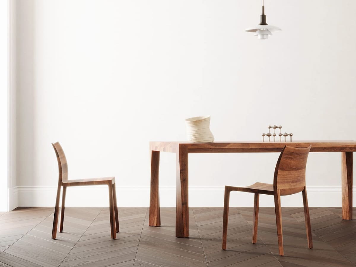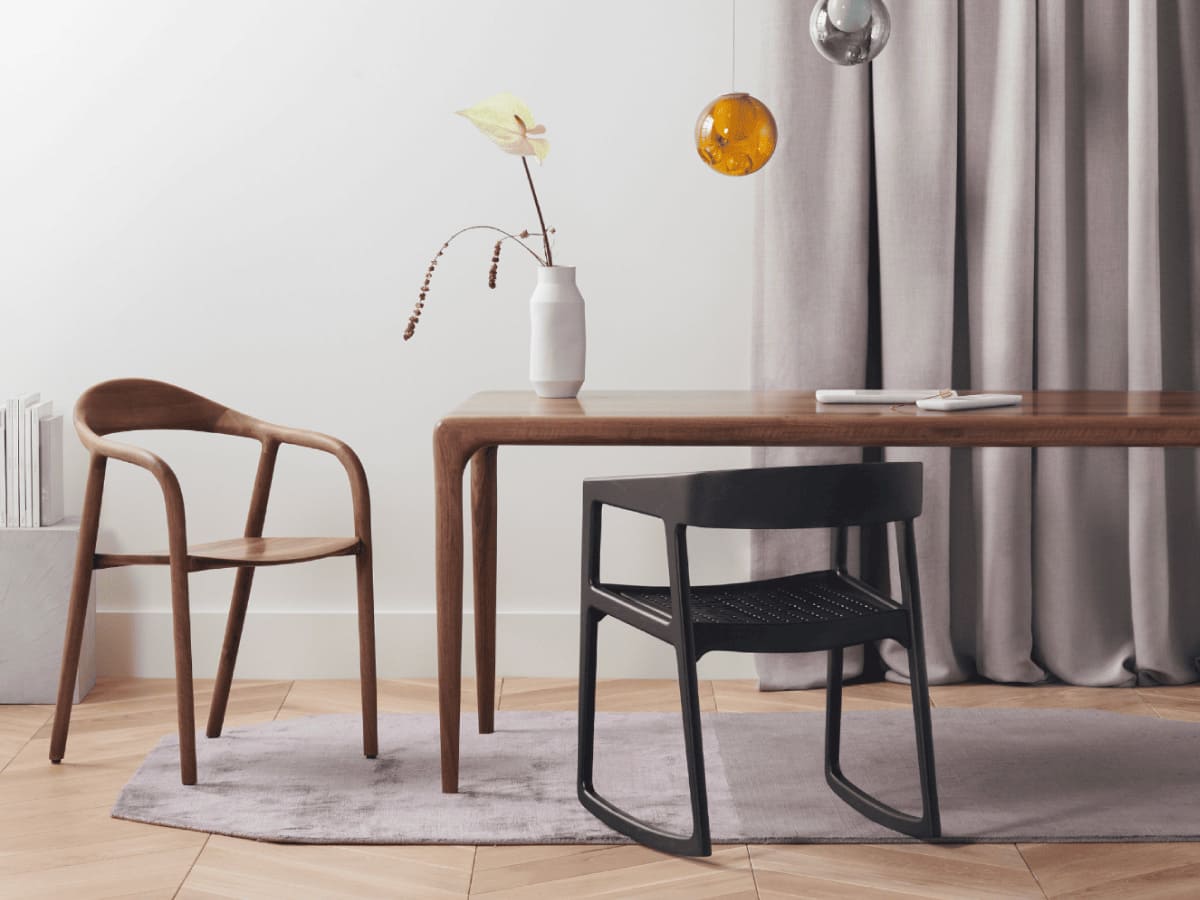 許多人擔心實木桌配實木椅會顯得像傳統圖書館,這時像 Artisan Neva 這種沒有銳角的雕塑型曲木椅就是解藥。另外,在長桌的兩端(主人椅位置)混搭不同顏色或造型張力更強的椅子(如 Karimoku SEYUN),也是歐美住宅常見的跳色軟裝手法。