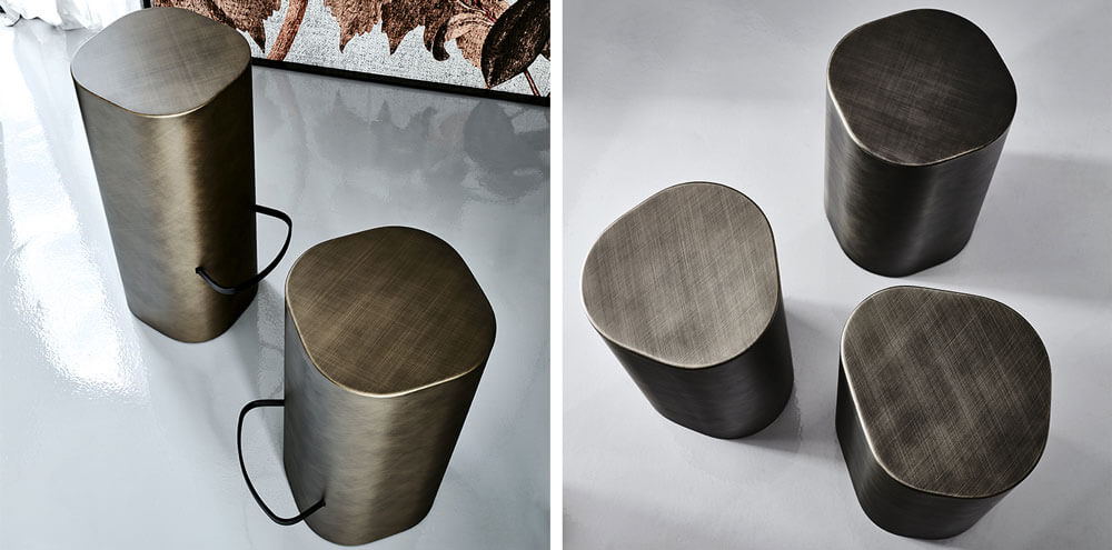 Etoile Consoles玄關桌材質,採用2020年新款 Brushed Grey 及Brushed Bronze ,特殊的處理方式造就了金屬面的水洗刷舊感,讓玄關桌外型向蒙上一層神秘面紗,同時卻能保有金屬亮面特性,內折型桌腳底部各有青銅色金屬點綴四腳,細節上低調卻閃耀著神秘光芒。