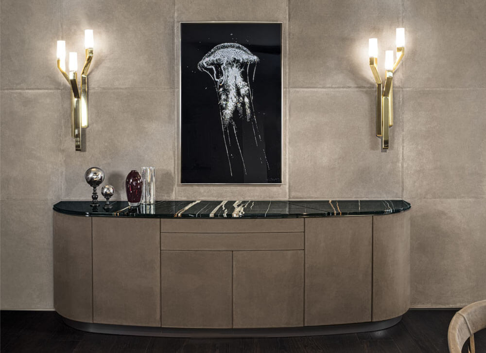 呈現充滿魅力的精緻環境美學,極致細膩的邊櫃材質,珍貴大理石散發潔淨光芒,喚醒現代時尚主張感受,完美總結了LONGHI家具品牌設計哲學,帶有門與抽屜的Keope邊櫃,頂部運用大理石材質凸顯現代輕奢韻味,提升生活空間質量。