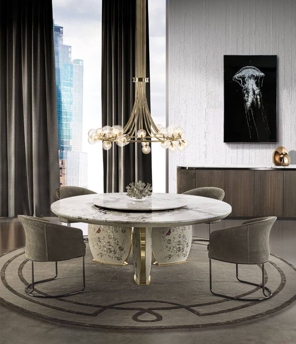 宛如量身訂做的時尚服飾設計,精心呵護著餐桌每處細節,展示精湛設計與手工刺繡,Lotus餐桌豐富且細膩的裝飾,增添居家生活美學質感,呈現花瓣綻放蔓延的餐桌腳圖面嵌入「Marlène」缎面刺绣,搭面纖細的金屬邊框,與柔和的半圓弧磨邊桌面,為餐廳家具提供全新藝術層面,現代輕奢風2021年新品餐桌推薦。