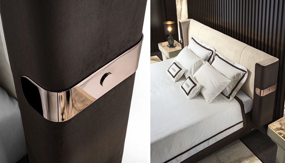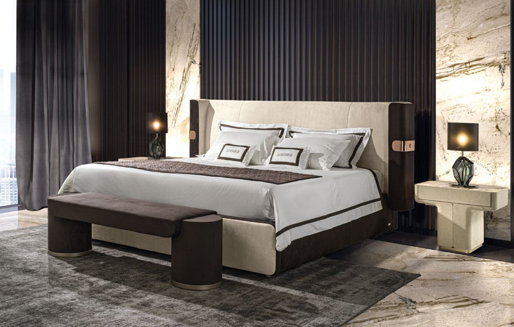 臥室家具MI床架與床尾椅,以實質的線條與建築式結構,展現無與倫比的特色,以包覆感外型豐滿床頭,豐富的細節充滿剪裁內涵,散發現代精神的美麗語言,搭配同色系床尾椅,讓臥室整體視覺更加優雅溫潤,現代輕奢臥室家具推薦。