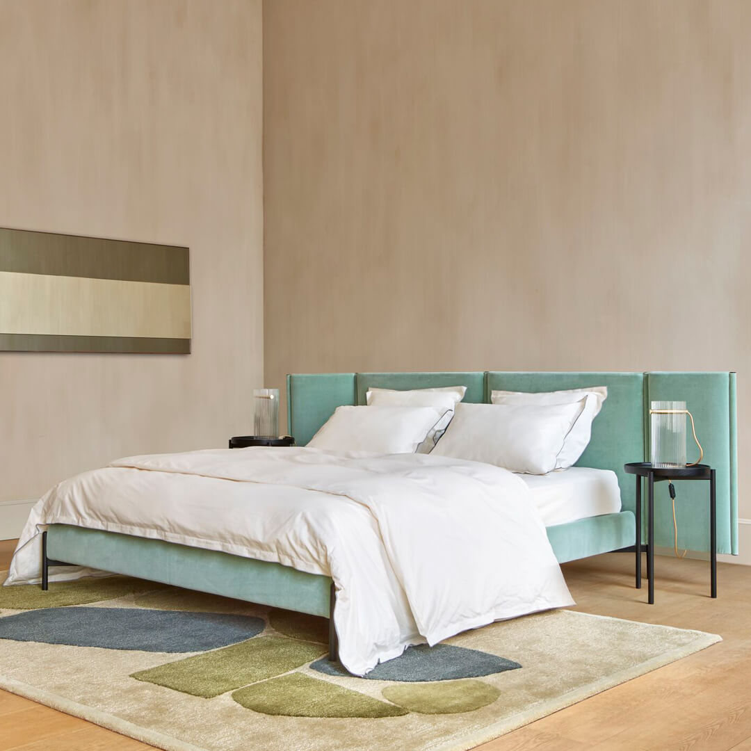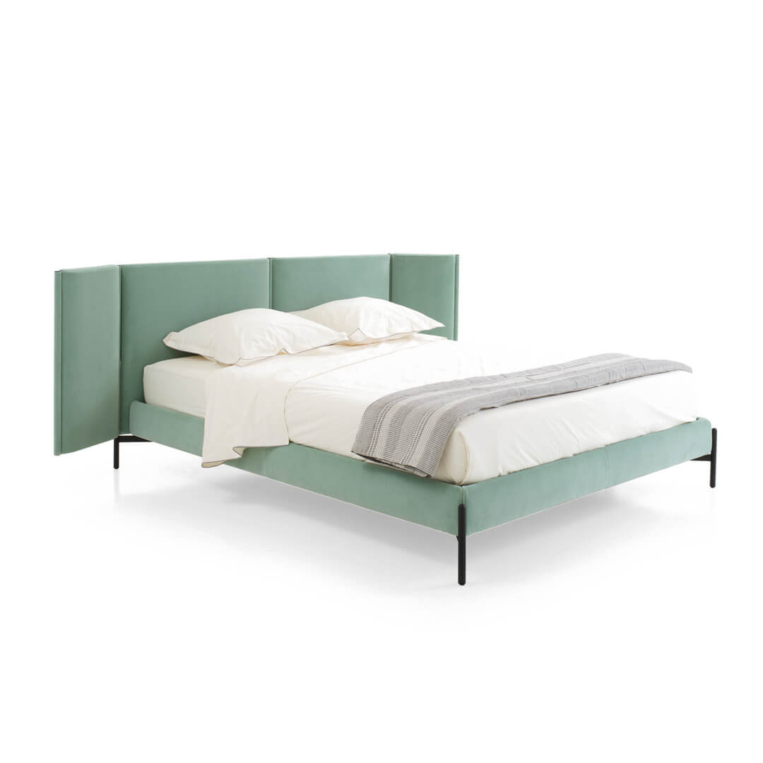 HYPNA 床架形似屏風的床頭板設計特點,床頭板兩側可活動折疊,依空間情境擺設調整開合角度,創造了安定和寧靜情境的睡眠空間。
