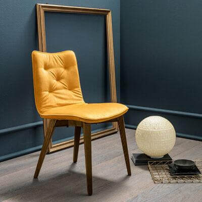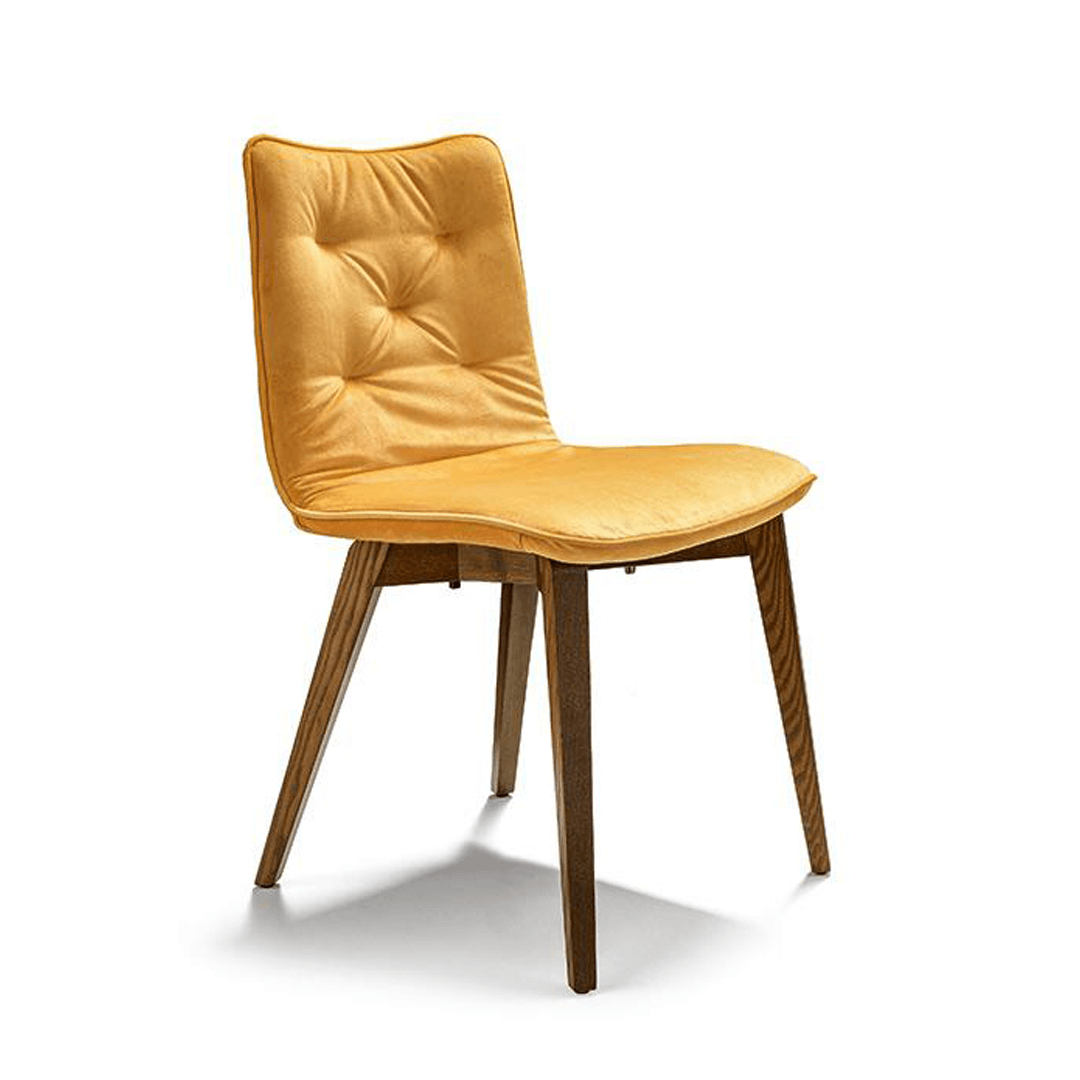 MAYA 餐椅 展現優雅風格,採用柔軟的天鵝絨布料,搭配絎縫靠背,並提供多種顏色選擇。染色白蠟木椅腳的優雅氣質與座椅的同色或撞色設計相得益彰,營造出和諧的風格對比。