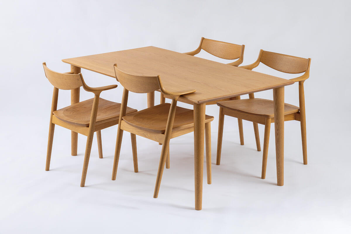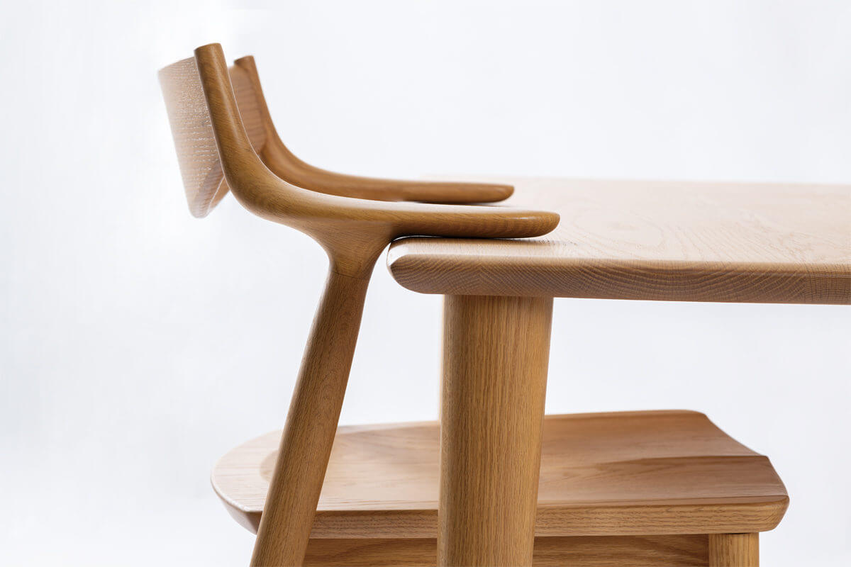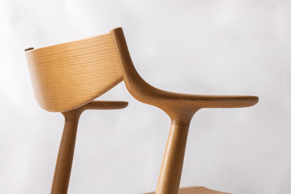 濱本工藝 由濱西邦和(Kunikazu hamanishi)設計的 No.7000餐椅,椅架採用曲木加工技術,打造舒適貼合的椅背及弧形扶手,展現了濱本工藝職人的精湛技術。扶手為短扶手設計,可掛置於桌面方便日常清潔,亦可盤腿坐於椅面不受阻礙。
