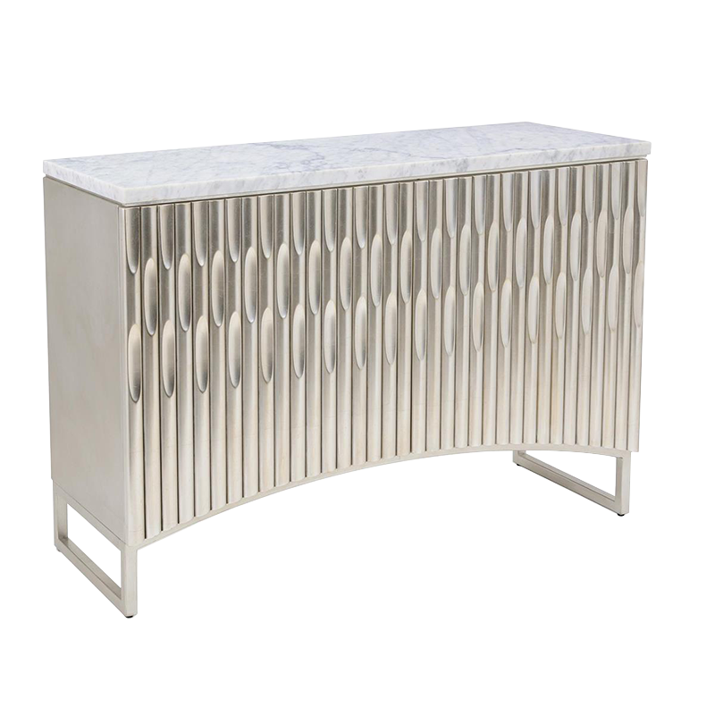 這款Bourdon玄關檯面是採用義大利的消光卡拉拉大理石,門片為手工雕刻打造,底部為鋼腳造型俐落,門片為有規則的羅紋凹形紋理貼銀箔。