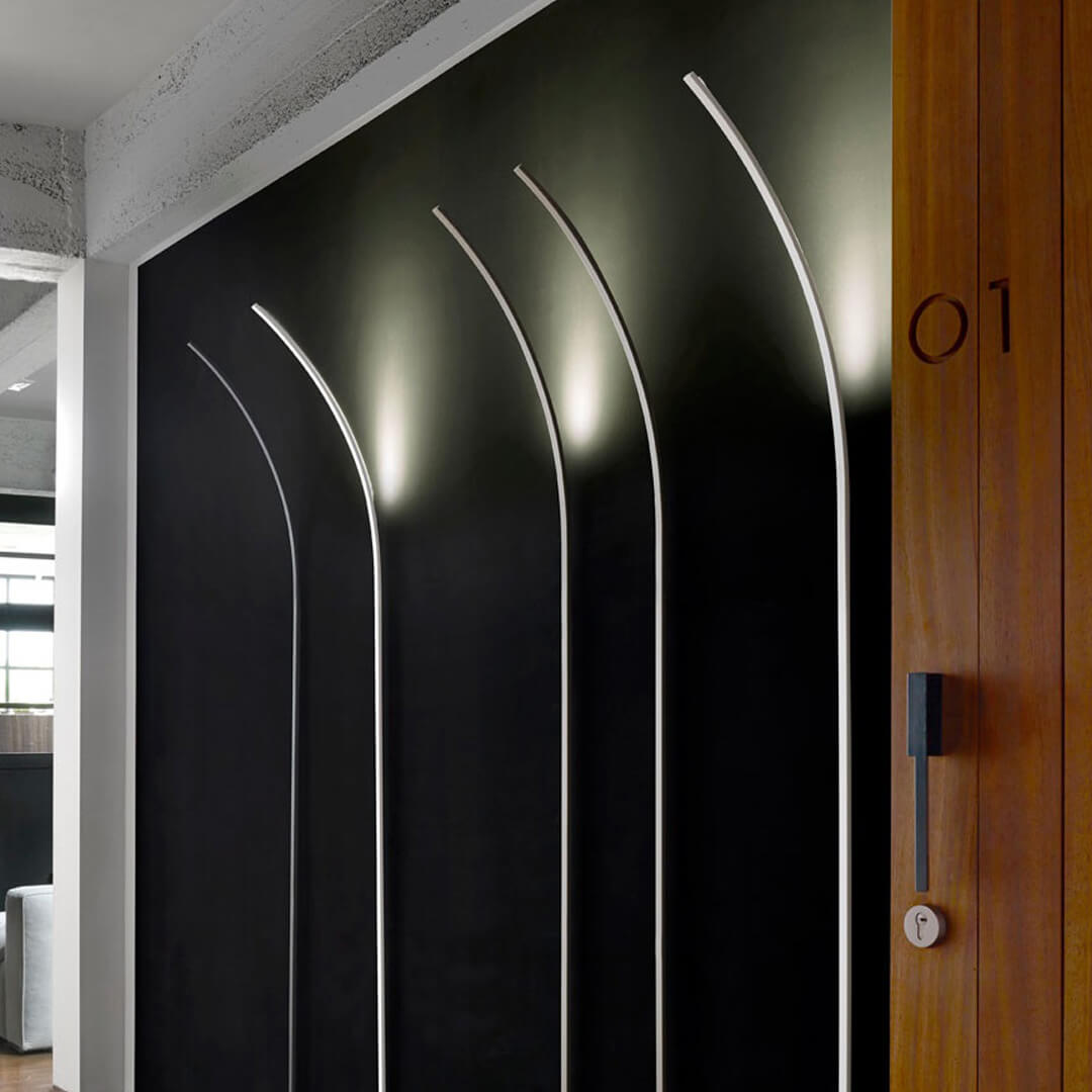 落地燈採用鋼製底座和燈桿,壁燈則採用20 x 10毫米烤漆鋁型材。間接照明由位於弧形上部後方的50公分LED燈帶