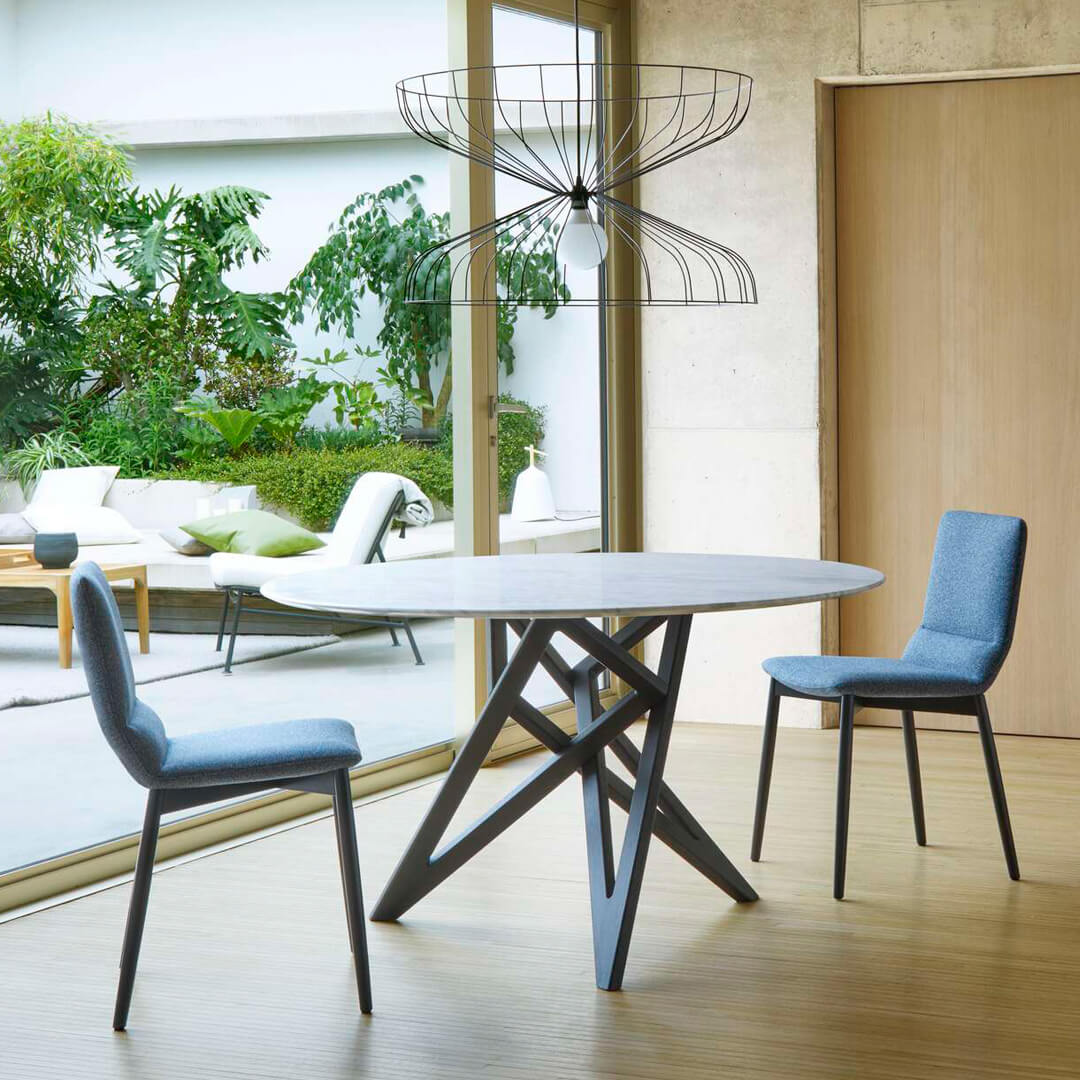 來自建築結構巧思的 ENNÉA 餐桌,桌腳由三個三角面向所構成的金字塔的結構,巧妙對應了希臘數字9(IX),簡潔輕盈卻又堅固。桌腳有黑色白蠟木/天然橡木 可做選擇,共有四種桌板樣式可做搭配。