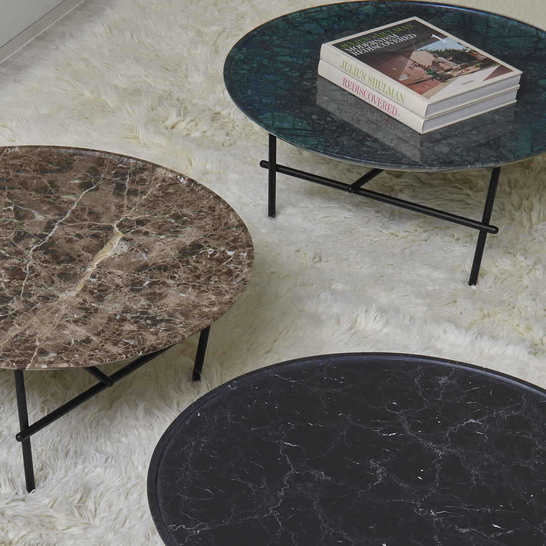 茶几 YURAGI鋼製底座演繹出一種亂中有序的,桌面圓周邊框特色,使其整體結構既簡單又復雜,可依室內風格挑選不同顏色的大理石桌面。