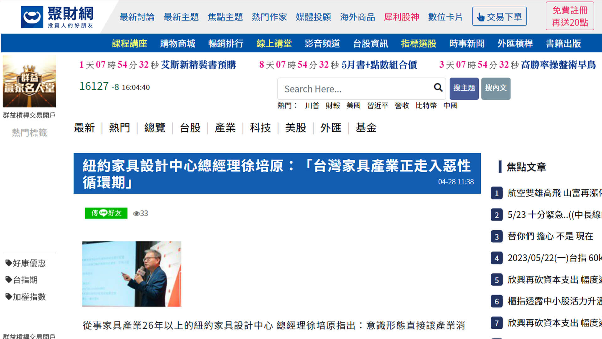 SETN三立新聞網 -家具產業面臨轉變!業者分析趨勢與挑戰 。邀請紐約家具設計中心的 徐培原 總經理,為大家說明台灣家具產業所面臨的危機與轉機,以及應對策略進行深入解析。同時也將分享歐美市場最新的趨勢,並就台灣家具產業的轉型以及國際家具設計未來趨勢做做分享與總結。