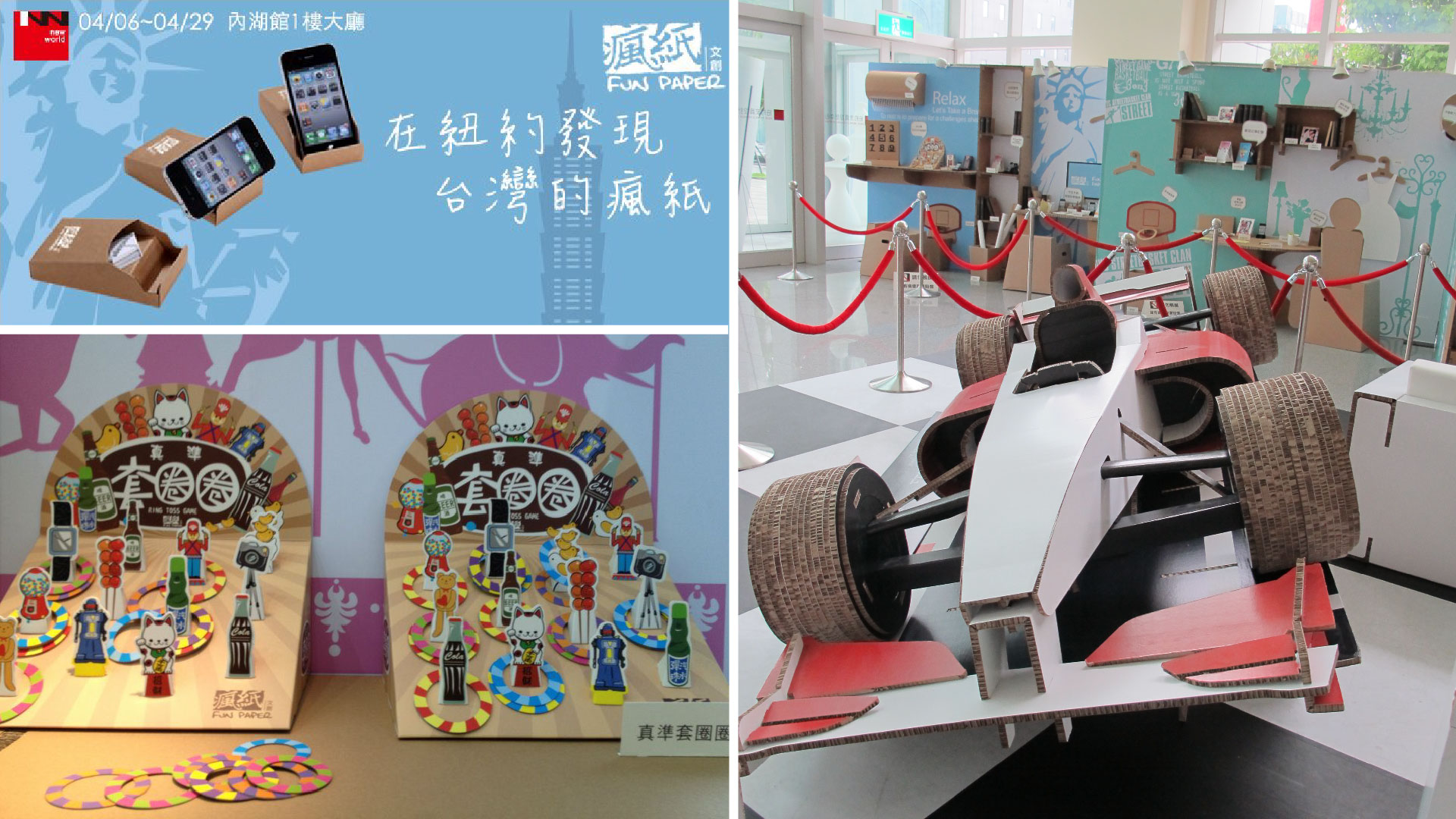 「紐約家具設計中心 – 台北內湖館」於2012年4/6(五)到4/29(日)舉辦「瘋紙藝術童玩趣」展覽,由「紙盒魔術師」–曹仲標 領軍,在1樓大廳展示各式各樣的紙作家具。展覽分為「辦公3C區」、「居家區」及「童玩區」,藉由情境佈置的方式,展現紙材與文創相結合並融入生活的創意火花。現場除1:1的紙作家具外,更有放大300%的大型童玩,如套圈圈、彈珠台及超大型九宮格…等,開放現場民眾體驗。